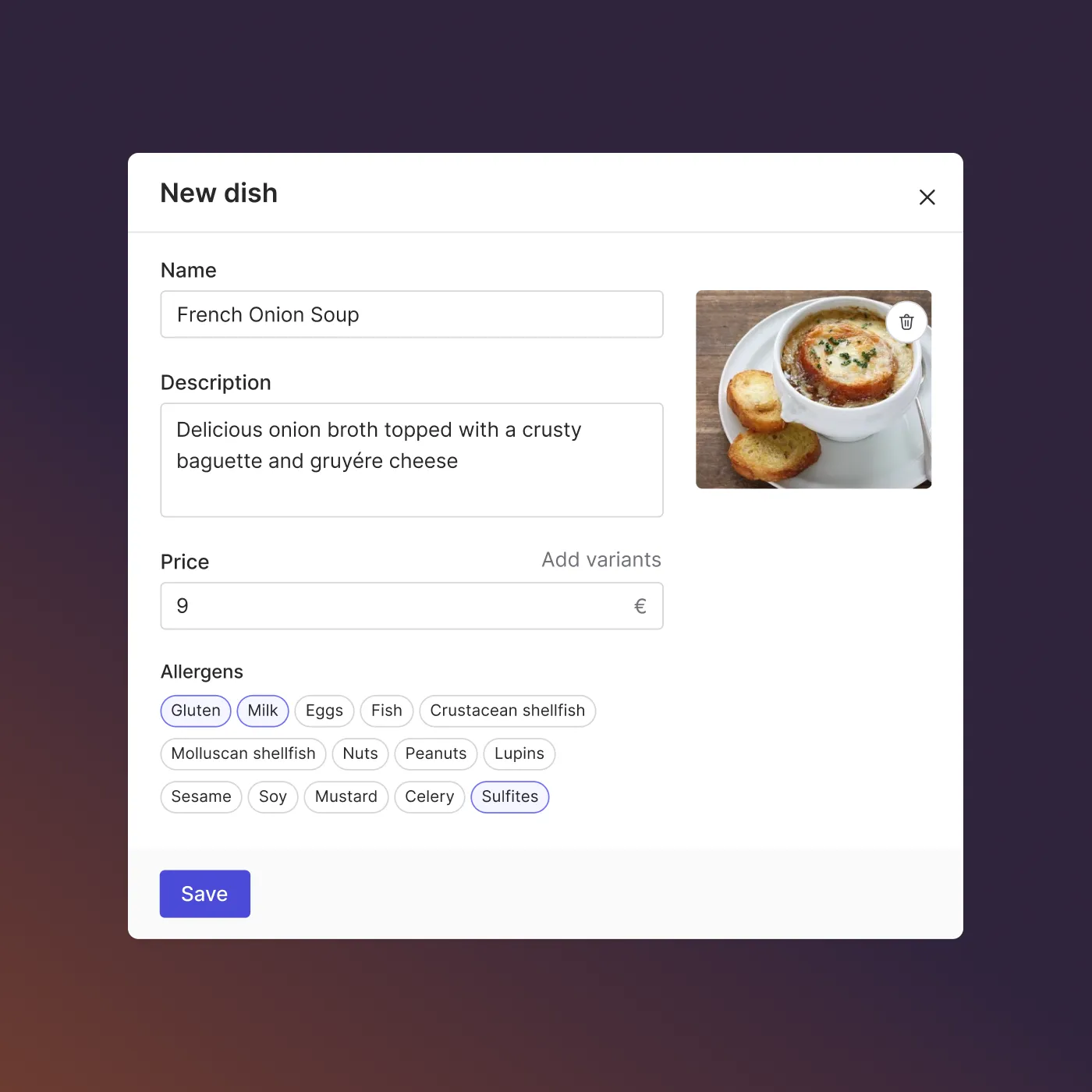 Make dining safer and easier for everyone! Quickly tag the allergens in your dishes so customers with specific dietary needs can enjoy their meal with peace of mind.