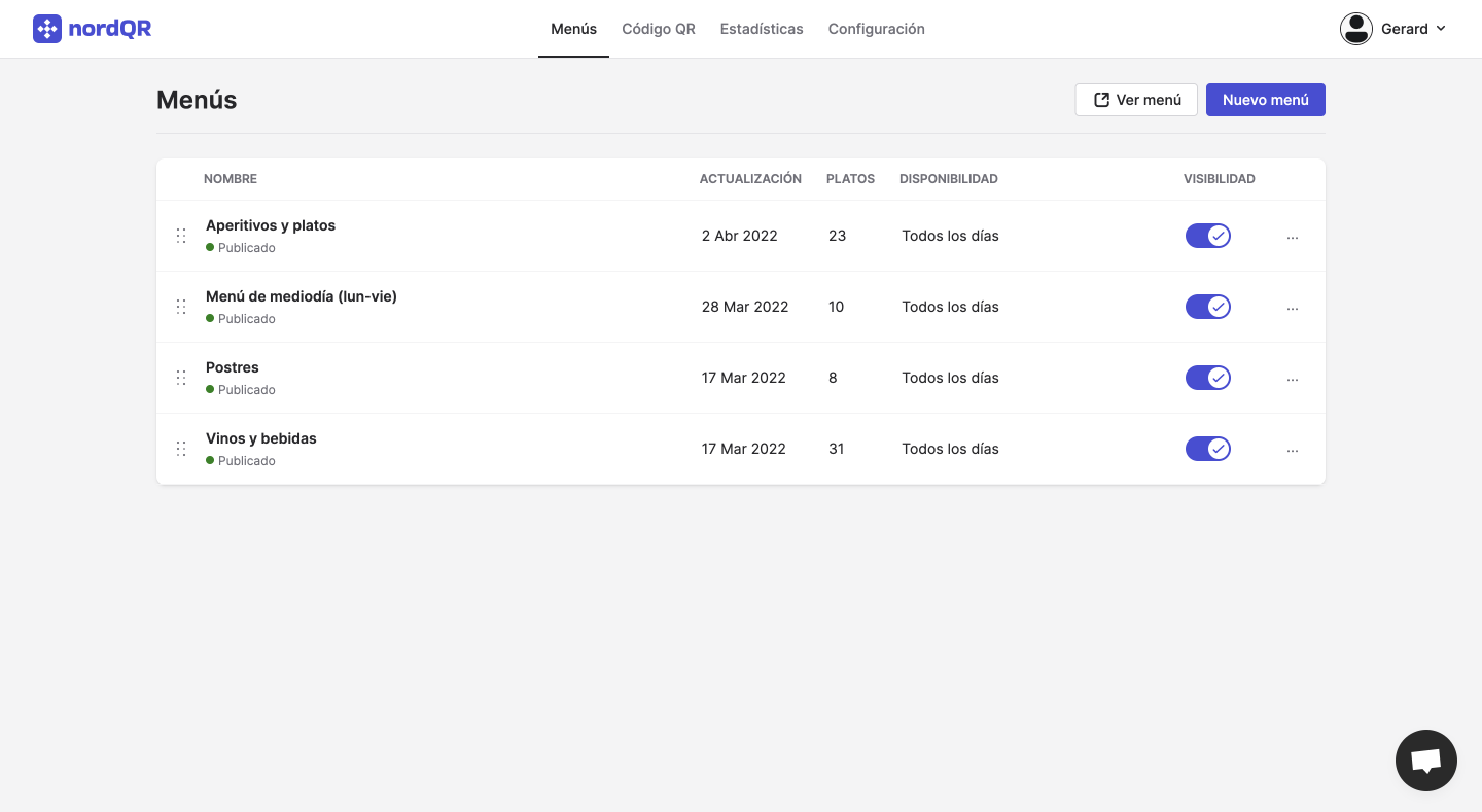 1) Accede a la sección Menús de tu cuenta de NordQR.