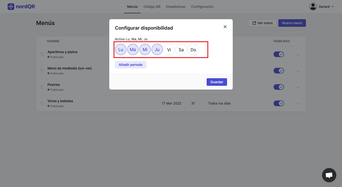 2) Selecciona los días que tu menú tendrá disponibilidad.