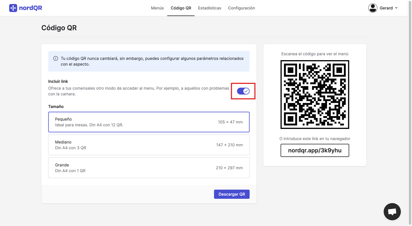 En NordQR todos los menús van asociados al mismo código QR. Para obtener el código QR sigue estos pasos:
